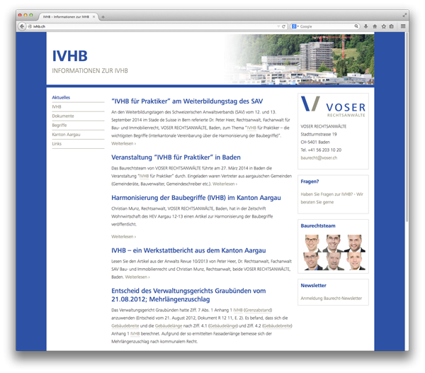 Im Übrigen befinden sich auf ivhb.ch sämtliche relevanten Dokumente zur IVHB unter besonderer Berücksichtigung des aargauischen Rechts. In gewissen Teilen befindet sich die Website noch im Aufbau. Nach und nach werden weitere Inhalte aufgeschaltet mit dem Ziel, Interessierten einen vollständigen Überblick über die zentralen Fragen im Zusammenhang mit der IVHB zu geben. Das Baurechtsteam von VOSER RECHTSANWÄLTE stellt sämtliche Informationen unentgeltlich zur Verfügung und freut sich über Inputs und Fragen zum Thema.